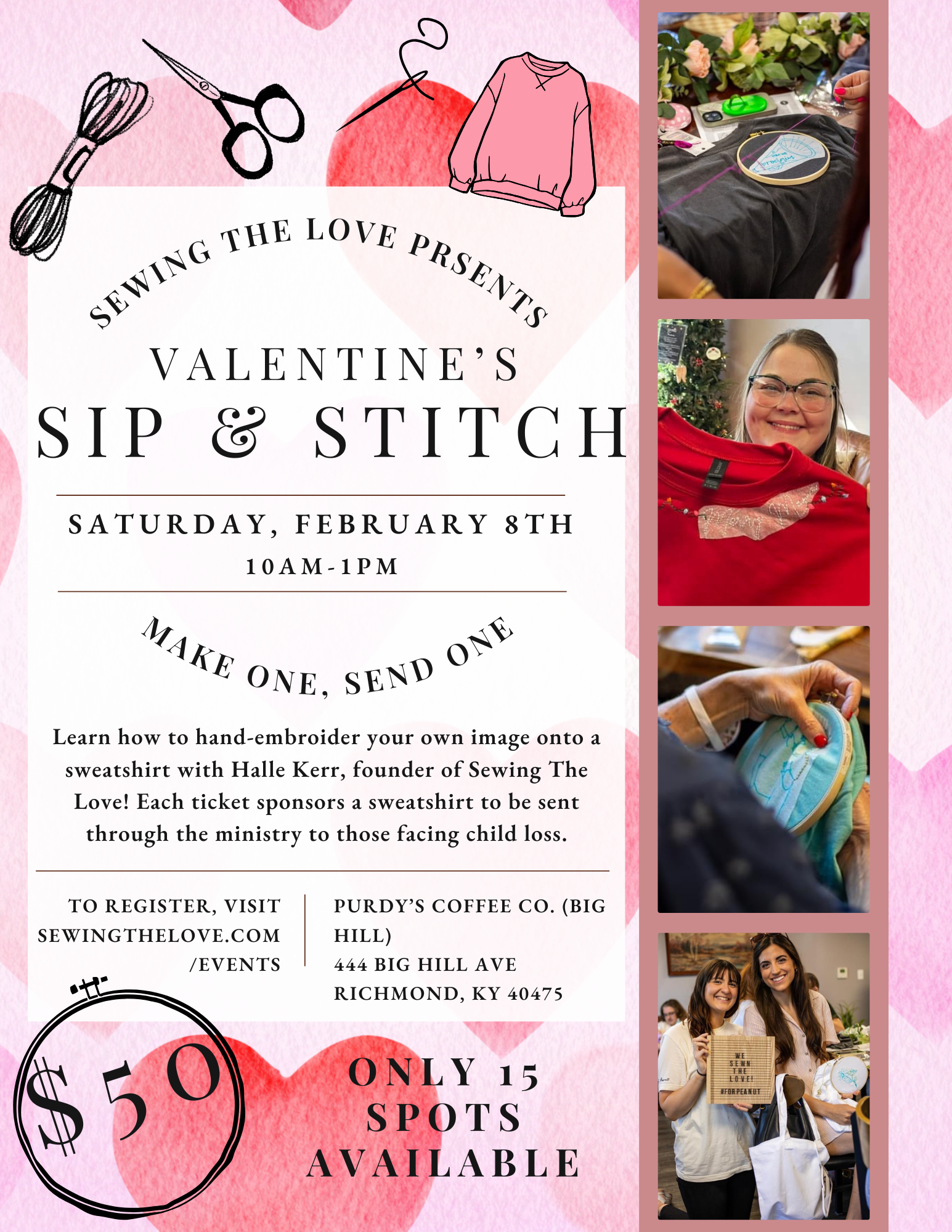 Come join us at our next Embroidery Workshop where you can learn how to make your own hand-embroidered sweatshirt like Halle sends through Sewing The Love! This is a beginner friendly class! Bring your friends and family, drink some yummy coffee and learn a new skill! Perfect for Christmas gifts! Each ticket covers supplies and sponsors a sweatshirt to be sent through the ministry to those walking through pregnancy and infant loss.